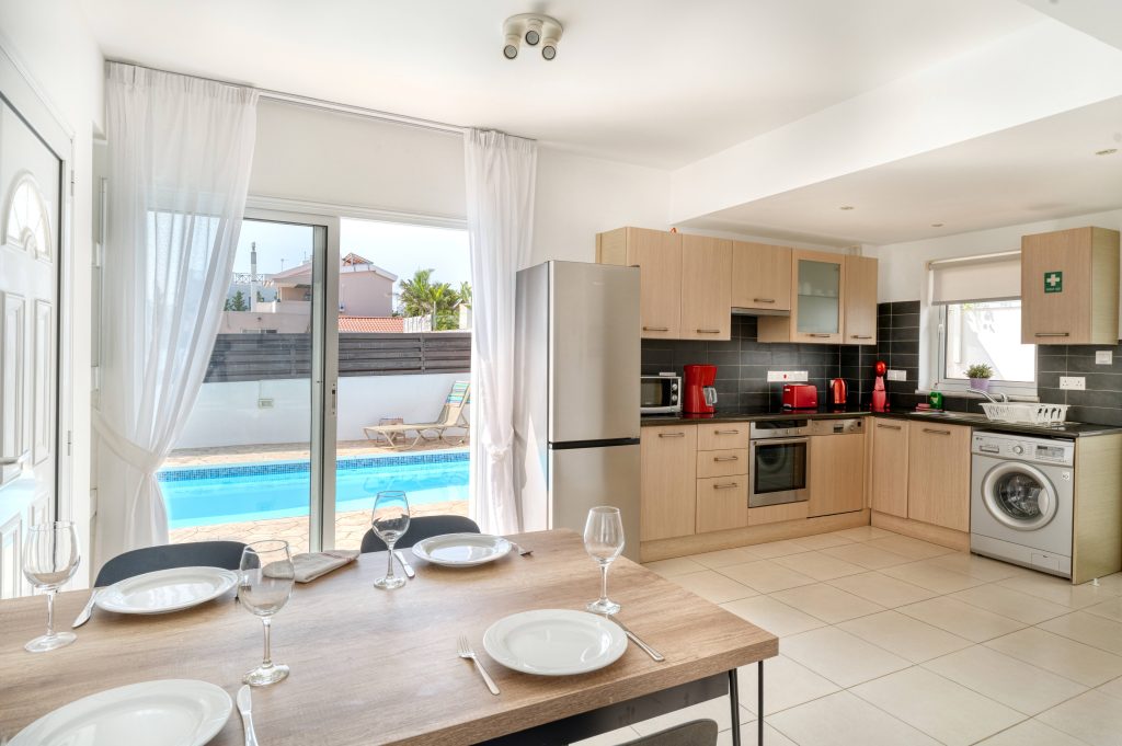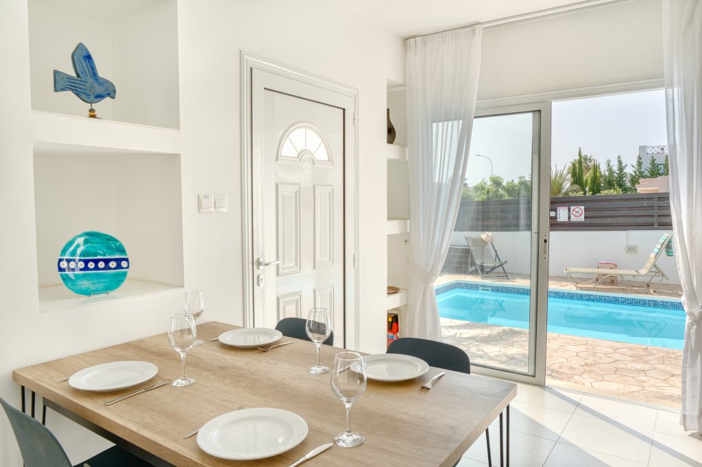 Only 300 meters from the nearest beach, this elegant 2 bedroom villa is fully air-conditioned and offers accommodation with private swimming pool, sunbeds, and umbrellas. The bright modern open plan kitchen, living and dining area open out onto the swimming pool terrace next to pergola shade with outdoor dining furniture. Next to the pool there is a BBQ facility.