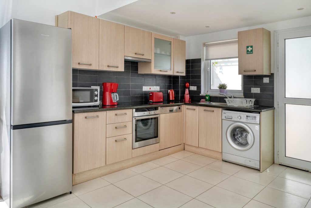On the ground floor, the fully equipped kitchen includes a dish washer, washing machine, coffee maker, toaster, shaker, kettle and a microwave. A smart/ android 43′ TV with satellite channels, free high speed Wi-Fi throughout, hair dryer, safe deposit box and iron facility are standard.