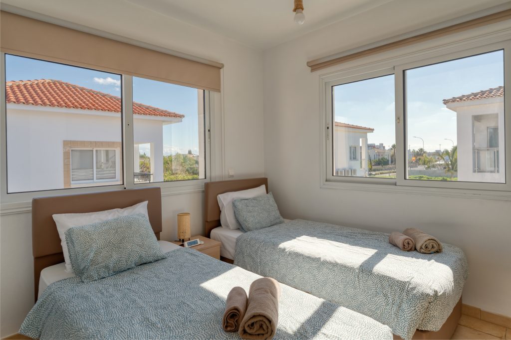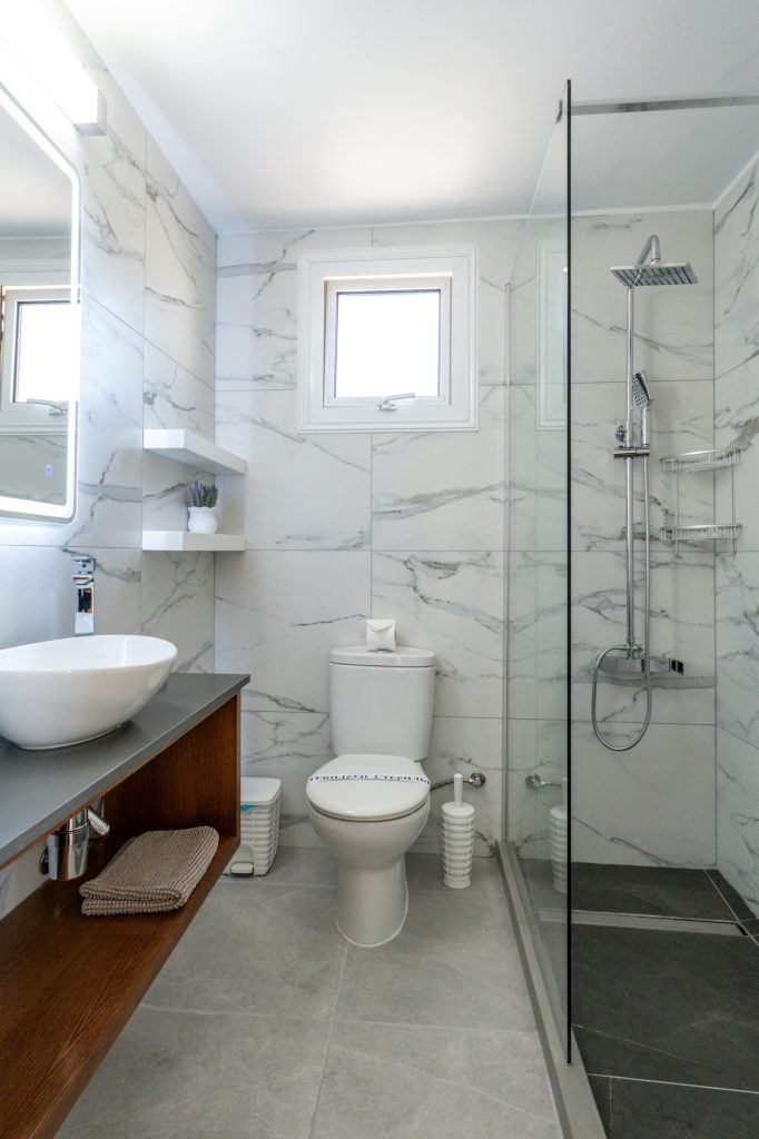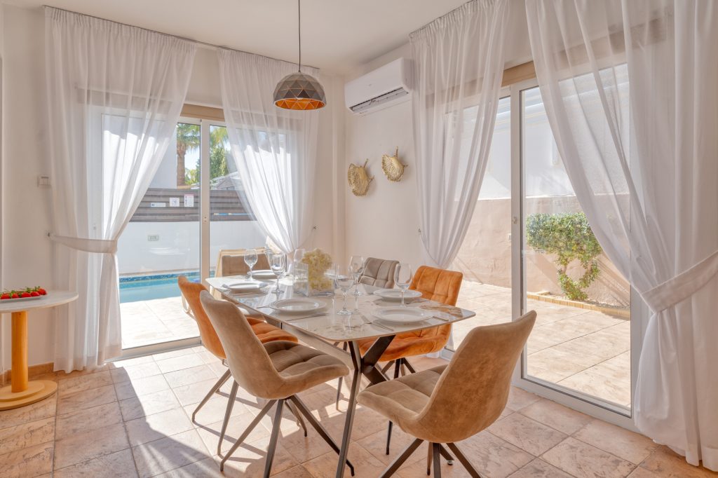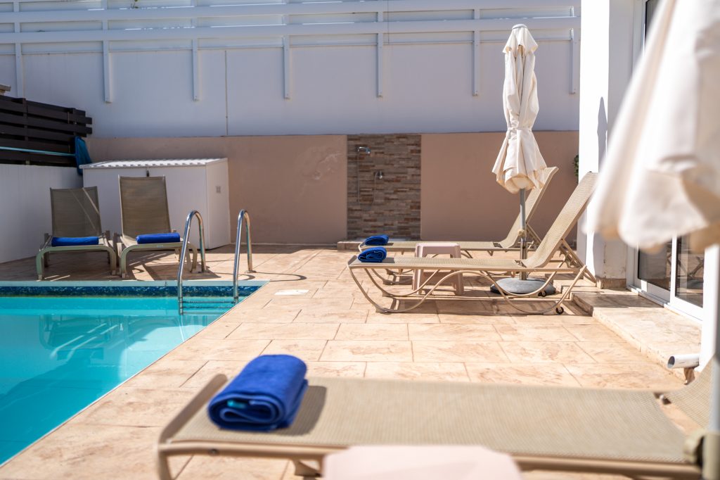 On the ground floor, the fully equipped kitchen includes a dish washer, washing machine, coffee maker, toaster, shaker, kettle and a microwave. A 43′ smart Android TV with satellite channels, free high speed Wi-Fi throughout, hair dryer, safe deposit box and iron facility are standard. Having a sofa bed (140X200cm) in the living room the villa can easily accommodate two extra adults, totaling 8 persons. Additional charge applies for the 7th and/or 8th person/s. There are also 3 bathrooms in the villa which they all have been fully renovated during February 2026. A shower and a toilet on the ground floor, a walk in shower with a toilet on the first floor and en-suite shower and toilet in the one of the double bedrooms.