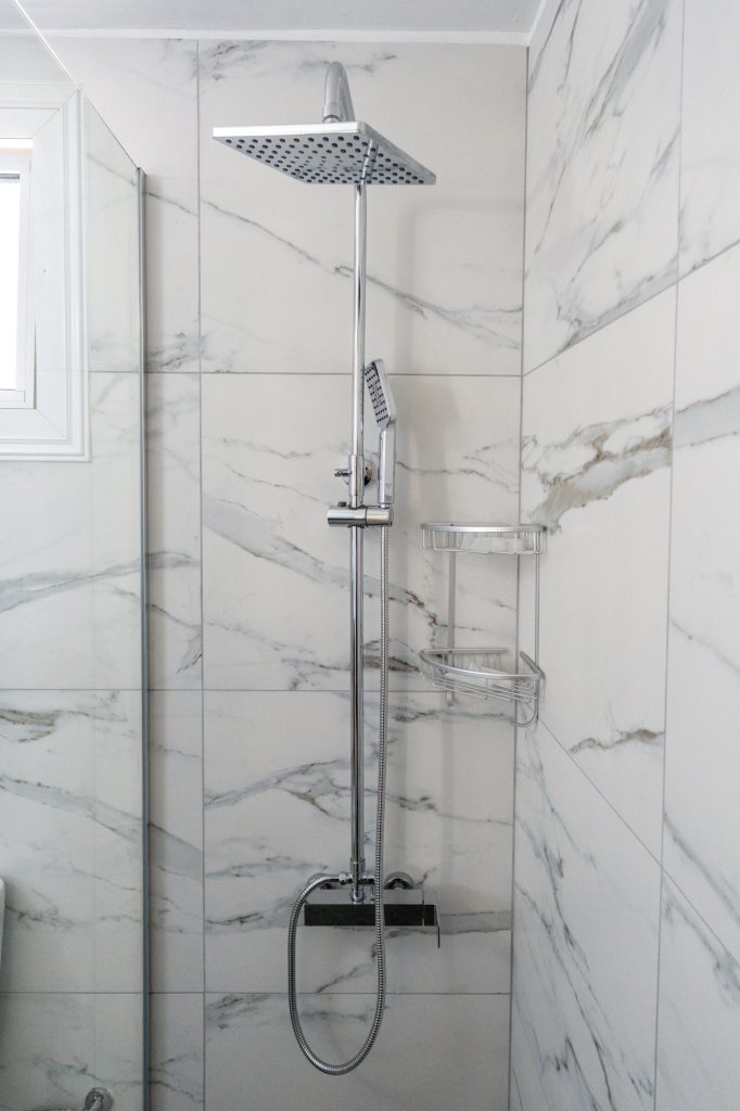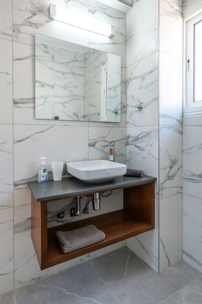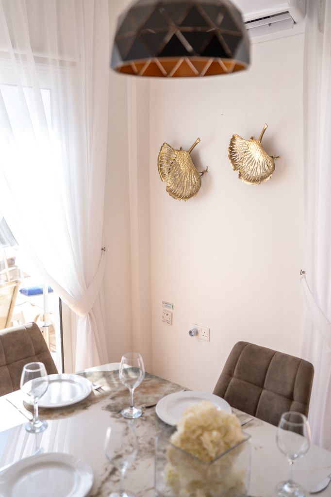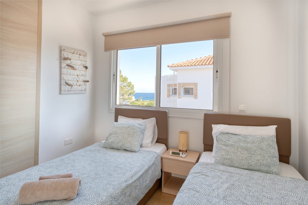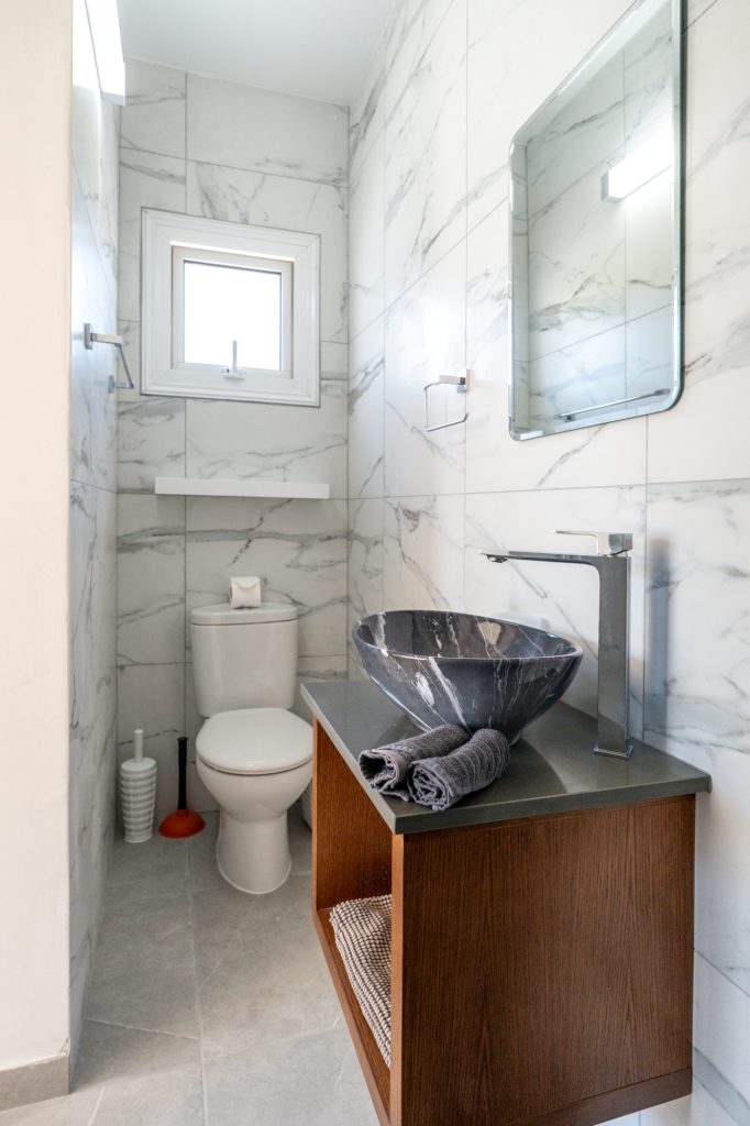 On the ground floor, the fully equipped kitchen includes a dish washer, washing machine, coffee maker, toaster, shaker, kettle and a microwave. A 43′ smart Android TV with satellite channels, free high speed Wi-Fi throughout, hair dryer, safe deposit box and iron facility are standard. Having a sofa bed (140X200cm) in the living room the villa can easily accommodate two extra adults, totaling 8 persons. Additional charge applies for the 7th and/or 8th person/s. There are also 3 bathrooms in the villa which they all have been fully renovated during February 2026. A shower and a toilet on the ground floor, a walk in shower with a toilet on the first floor and en-suite shower and toilet in the one of the double bedrooms.